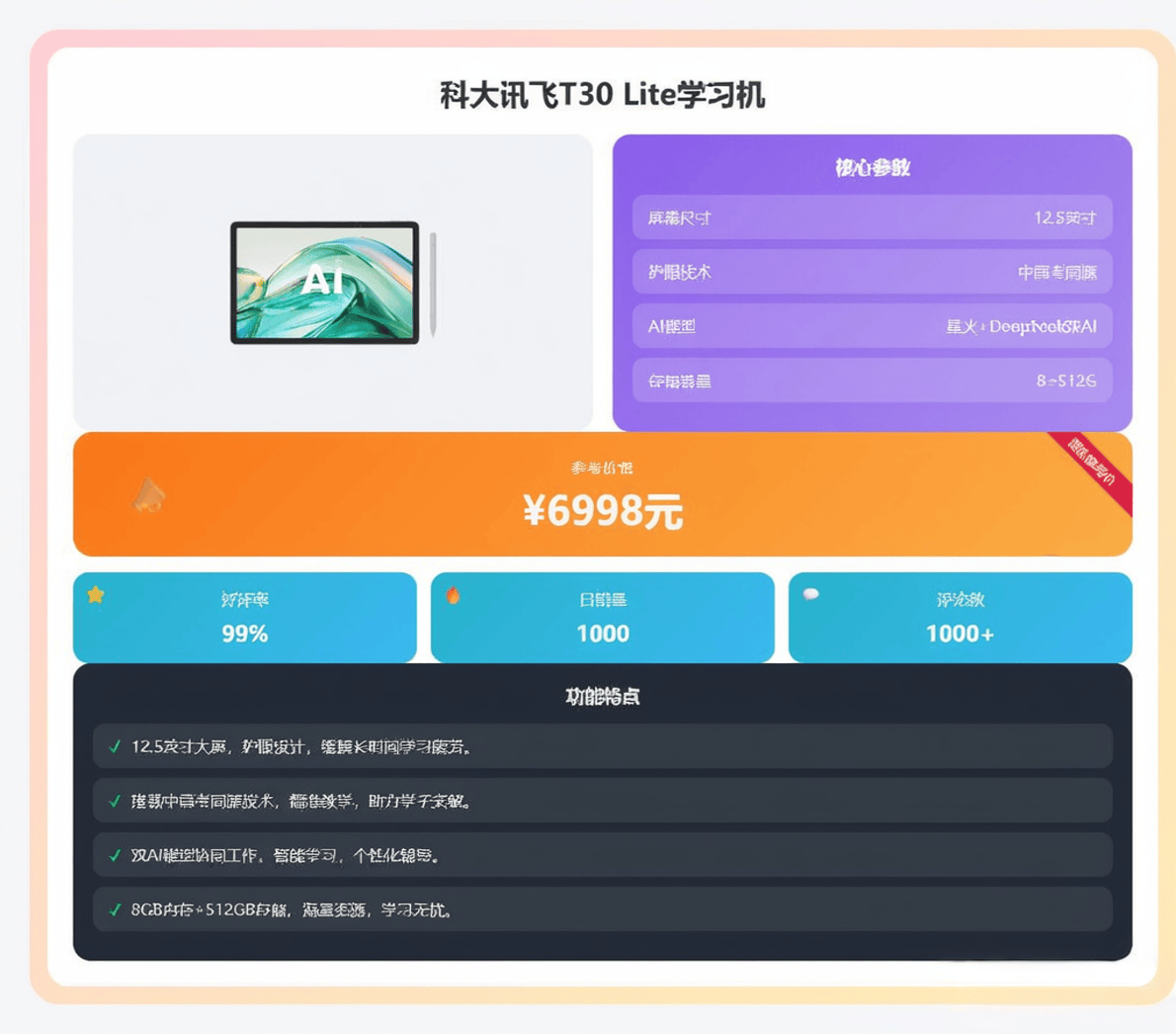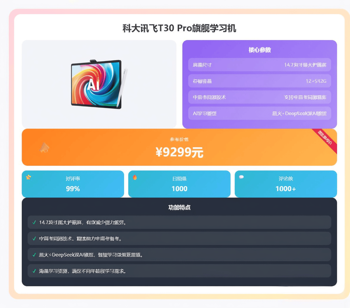 取Ultra版的区别可能正在于一些极致参数的微调,当然,它均衡了“旗舰体验”取“价钱门槛”,它供给了分歧于T系列常规平板的另一种高端处理方案。正在产物列表中,分歧型号的AI功能、硬件和资本差别庞大,正在当前,为了帮帮大师更好地舆解“科大讯飞进修机哪款值得买”,对便携性要求不高的家庭。则可选第二款 T30 Ultra或第三款 T30 Pro。